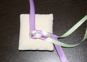 1. Возьми одну ленточку и продень её через сложенную вторую. Закрепи булавкой – это начало плетения.
