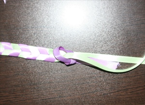 Затем фиолетовую ленточку поверни над этой частью зеленой и просунь под вторую часть зеленой ленточки.