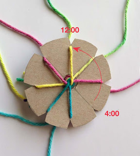Теперь снова поверни круг так, чтобы пустующий слот занял позицию 12:00. Так ты будешь равномерно закручивать нити в красивый браслет.