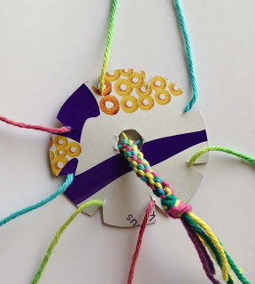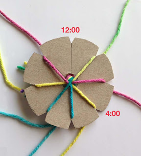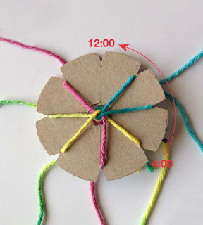 Продень ниточки через центр окружности, так чтобы узелок остался с низу, и закрепи каждую нить в отдельное треугольное углубление по краям. Одна часть нашего инструмента окажется без нитки. Расположи свой инструмент для плетения браслета так, чтобы полоска без нитки совпадала со стрелкой на 12, если бы смотрели на часы.