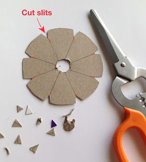 Самостоятельно или с помощью родителей вырежи небольшое круглое отверстие по центру, и также маленькие треугольнички на концах каждой линии.