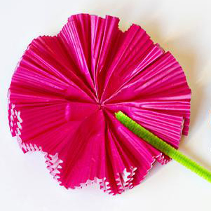 К обратной стороне цветка приклей стебелек. Стебель для цветка можно сделать из картона или бмаги, если согнуть ее в тоненькую трубочку и склеить. Стебель можно покрасить зеленой краской или обклеить зеленой бумагой, или обклеить зеленой тканью.