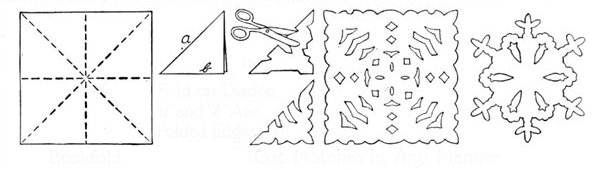 И на получившемся треугольничке можно нарисовать контуры с примеров на картинке сверху. Потом нужно будет вырезать все детали снежинки по контурам и развернуть снежинку.