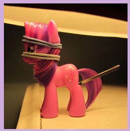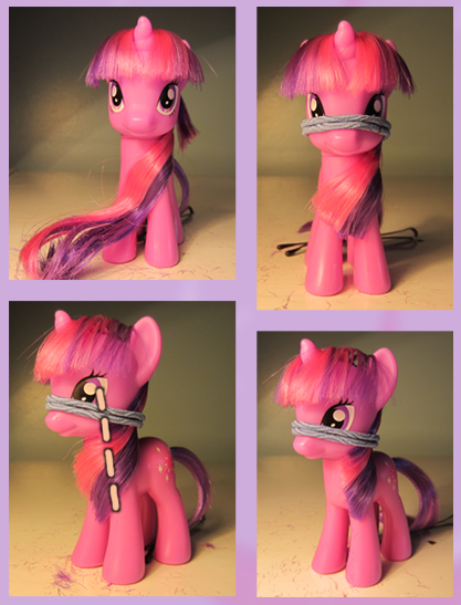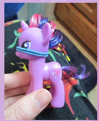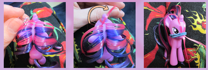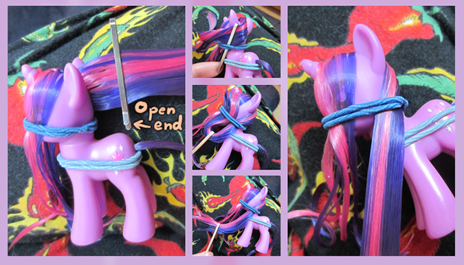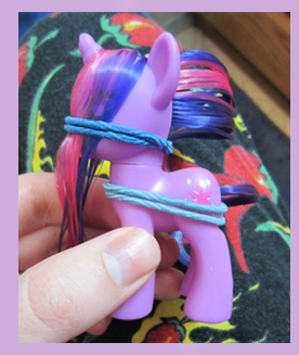 10. Теперь оберни резинкой тело Твайлайт, так чтобы резинка проходила под хвостом. Если нижняя часть гривы успела высохнуть, намочи ее.