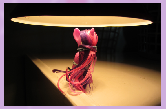 Ускоренный способ - поставить Твайлайт под настольную лампу на несколько часов, но тут нужно быть очень аккуратной и не ставить фигурку сильно близко, иначе лампа может перегреть пластик или того хуже подпалить волосы фигурки. В любом случае, если ты выбираешь вариант с лампой фигурку нельзя оставлять без присмотра!