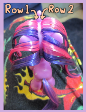7. Чередуя пряди, перекидывай их вперед. Остановись примерно в в том месте, где у Твайлайт находятся ушки. Не забывай прятать пряди под резинку.