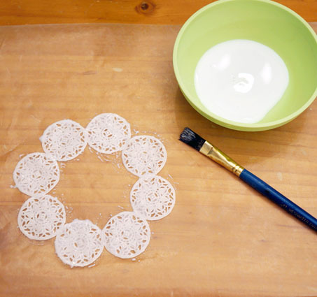 Из салфетки вырезаем нужный нам узор и кистью на заднюю поверхность салфетки наносим тонкий слой белого клея (к примеру, ПВА). Клей предварительно можно смешать с небольшим количеством воды. Много клея не нужно, иначе он впитается в салфетку, и при попытке поднять салфетку с поверхности стола она порвется.