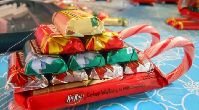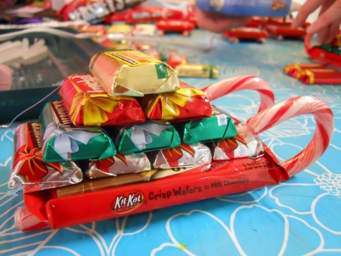 Останется только обернуть сани праздничной ленточкой и закрепить бантик и твой оригинальный подарок готов. Если вы планируете новогоднюю ёлку в школе или дома с друзьями, то вы можете вместе с учительницей или родителями сделать много таких подарков для всех.