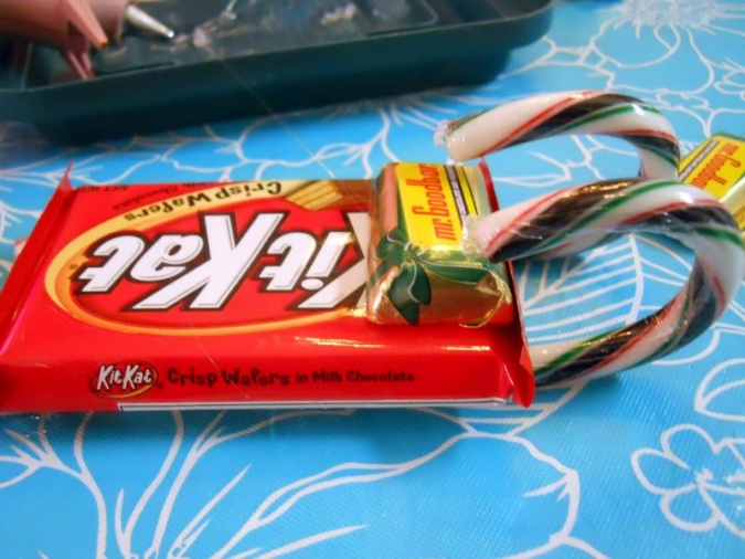 Первым делом к шоколадке самого большого размера (примерно с обычный Kit Kat) нужно приклеить леденцы, чтобы они формировали лыжи саней. Автор мастер класса использовала горячей клей, но нам кажется что лучше отрезать небольшие кусочки двустороннего скотча.