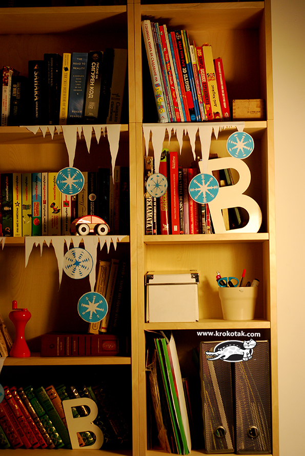 Останется только приклеить снежинки на сосульки, а сосульки на двери, полки, окна. Только для этого лучше согласовать с родителями материал, которым ты будешь приклеивать свои зимние украшения. Лучше всего это сделать обычным прозрачным скотчем.