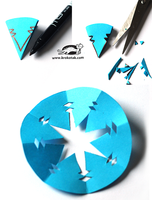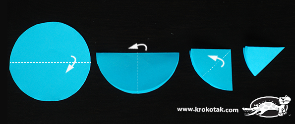 Первым делом сделаем несколько снежинок. Для этого возьми лист цветной бумаги, очерти круг и вырежи его. Круг сложи пополам как это показано на примере, затем еще раз пополам, но уже в другом направлении, а затем еще раз сложи его пополам.