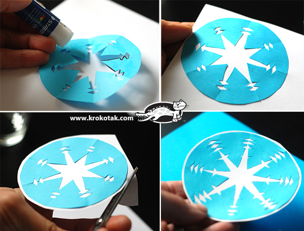 Возьми лист белой бумаги, приклей к нему раскрытую снежинку и вырежи по контуру окружности снежинки. Сделай несколько таких заготовок, моно брать голубую и синюю цветную бумагу разных оттенков.