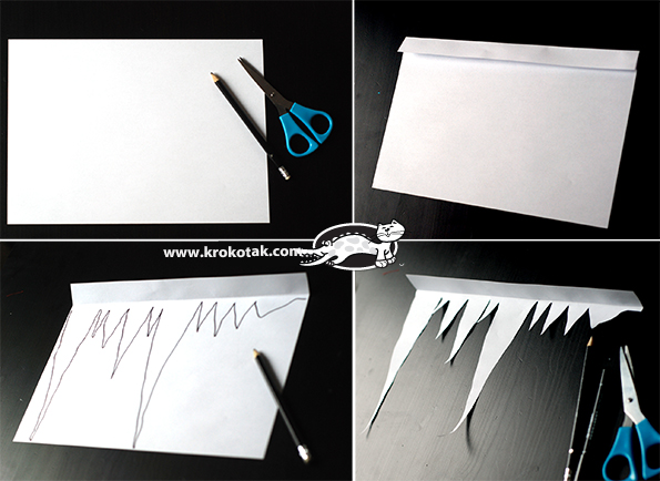 Теперь возьми лист белой бумаги, отогни верхнюю часть как на примере, на нем нарисуй сосульки разной длинны и вырежи их.
