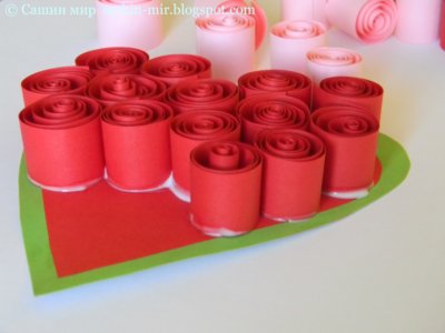 Тебе понадобится цветная бумага двух цветов: красного (розового или любого другого - какого цвета ты хочешь сделать розочки в букете) и зеленого для листочков. Также тебе понадобится основание для букета. Это может быть кружок из картона, например.