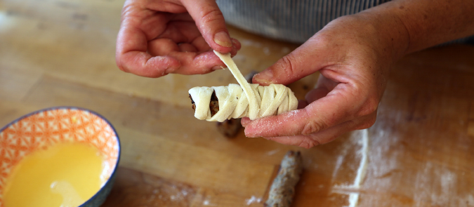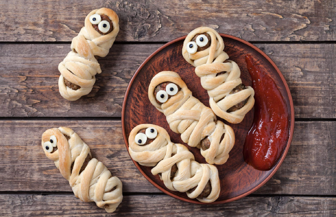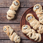 Здесь всё просто, готовится также как обычные сосиски в тесте, только тесто раскатывается в тонкую полоску, а затем наматывается на сосиску, имитируя бинты на мумии. Глазки можно сделать с помощью кусочков сыра и перца или нарисовать кетчупом (поставить две точки).