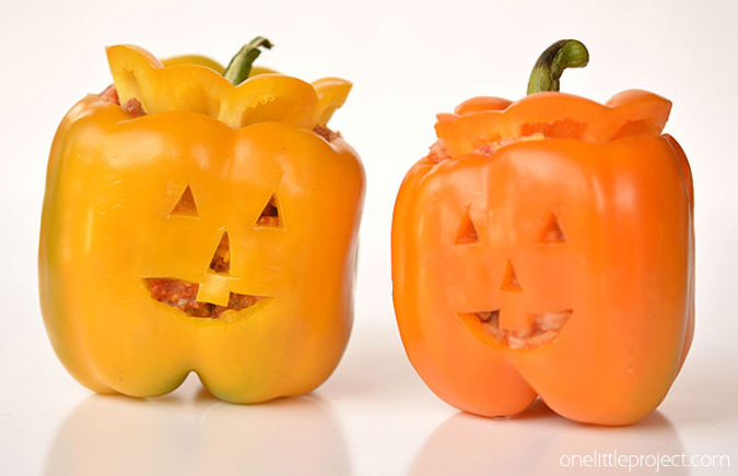 Во-первых оранжевый болгарский перец, с вырезанной спереди мордочкой будет смотреться как отличная имитация тыквы. Перец нужно помыть, аккуратно по кругу вырезать крышку, вынуть семена и вырезать традиционную мордочку с одной стороны. Теперь в таком перце можно подавать как салаты, так и некоторые горячие блюда!