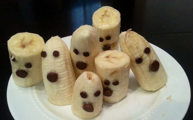 3 вариан - бананы привидения. Здесь все еще проще. Чистим банан и с помощью кусочков шоколада или шоколадной пасты рисуем ему глаза и рот.