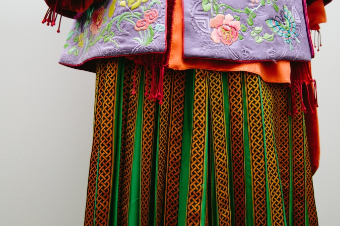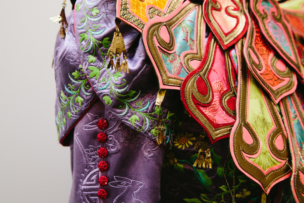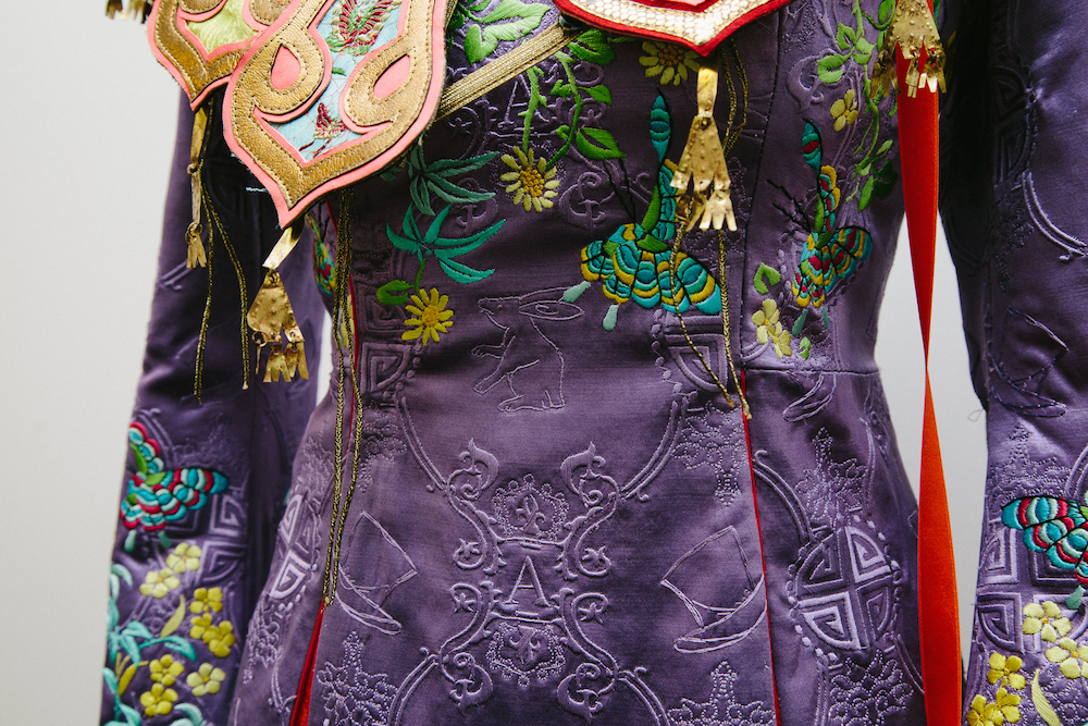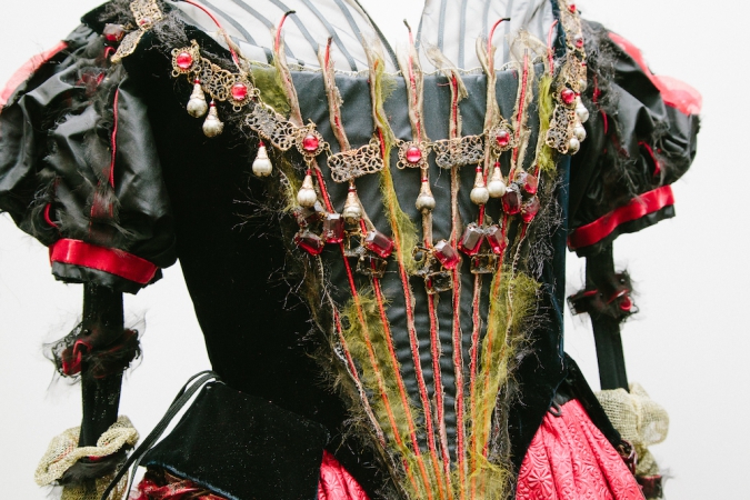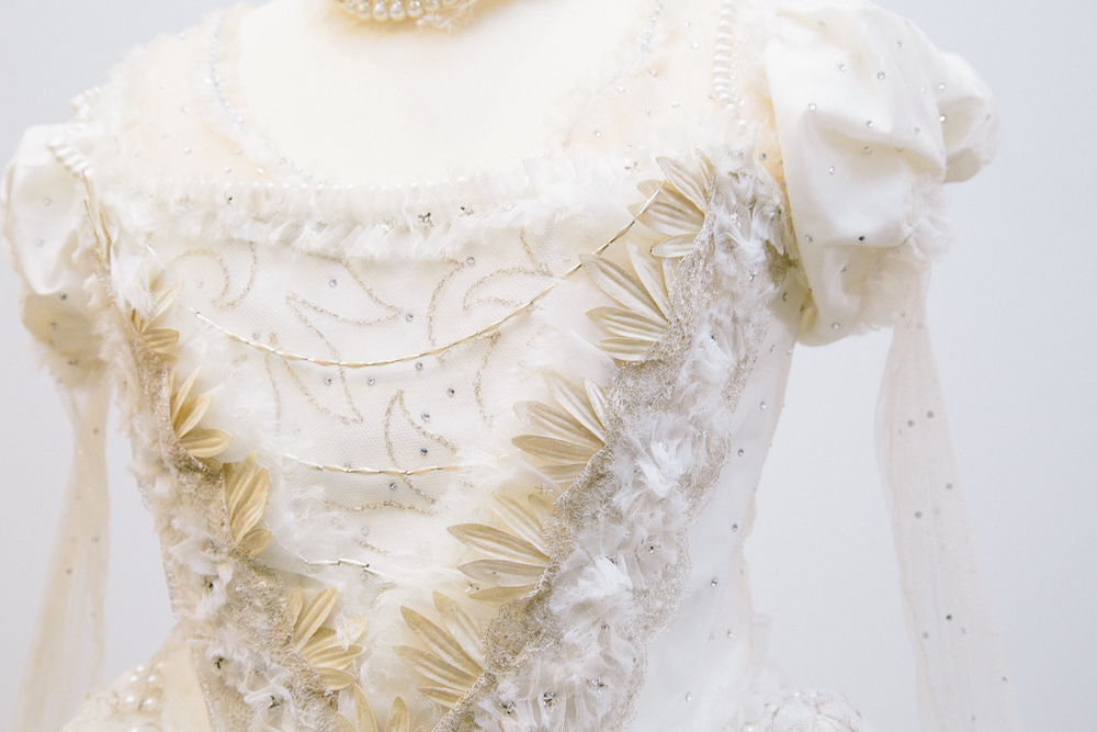 Костюм Алисы отражает приключения, которые она пережила в своем кругосветном путешествии. На центральной части костюма видна вышивка с милыми сердцу Алисы деталями: изображением Белого Кролика, шляпы Шляпника и инициала самой Алисы в виде буквы "А".