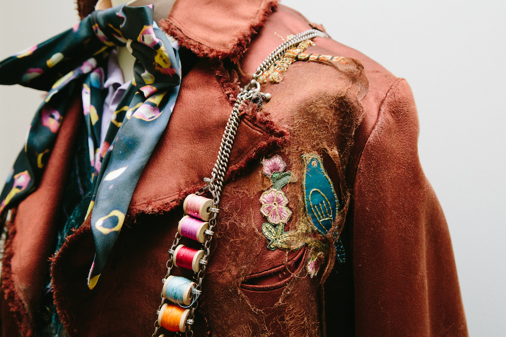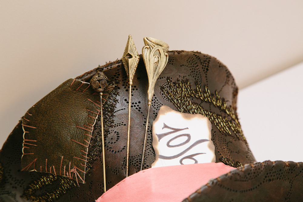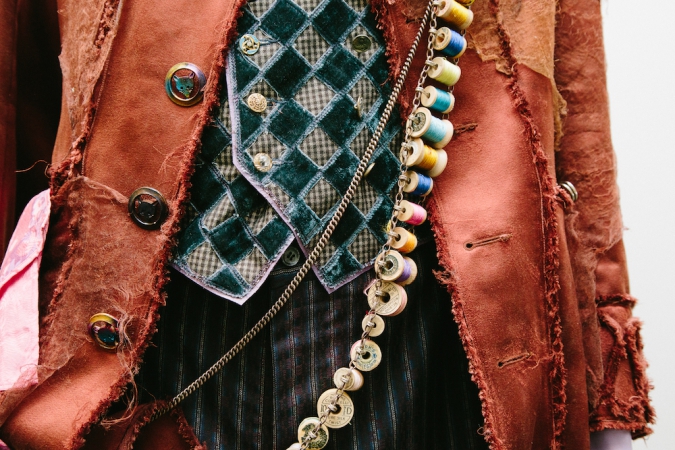 Учитывая профессию Шляпника, неудивительно что его костюм полон невероятно красивых и оригинальных аксессуаров. Таких как перевязь в виде катушек ниток, или огромной булавки с повязанными ленточками. Обрати внимание на лисьи мордочки на пуговицах его пиджака, и вышивку на его фирменной шляпе.