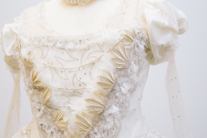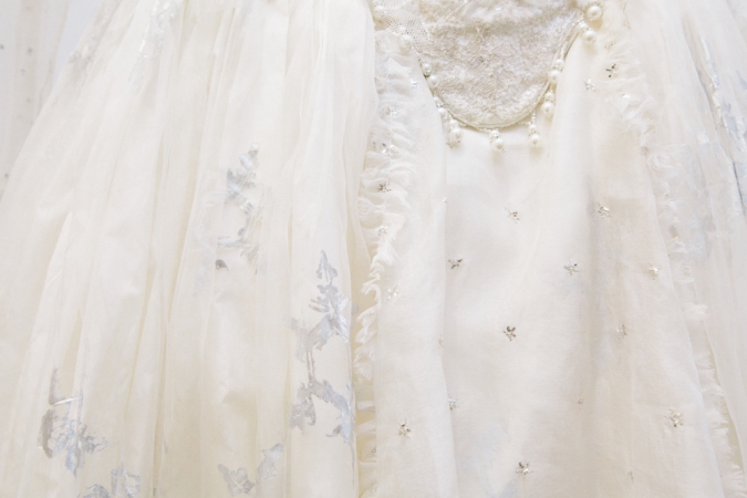 Платье Белой Королевы очень воздушное, нежное, сшитое из многих слоев тюля и других легких тканей. Оно украшено кристаллами и перьями, а на юбке можно увидеть принт из серебряных снежинок.