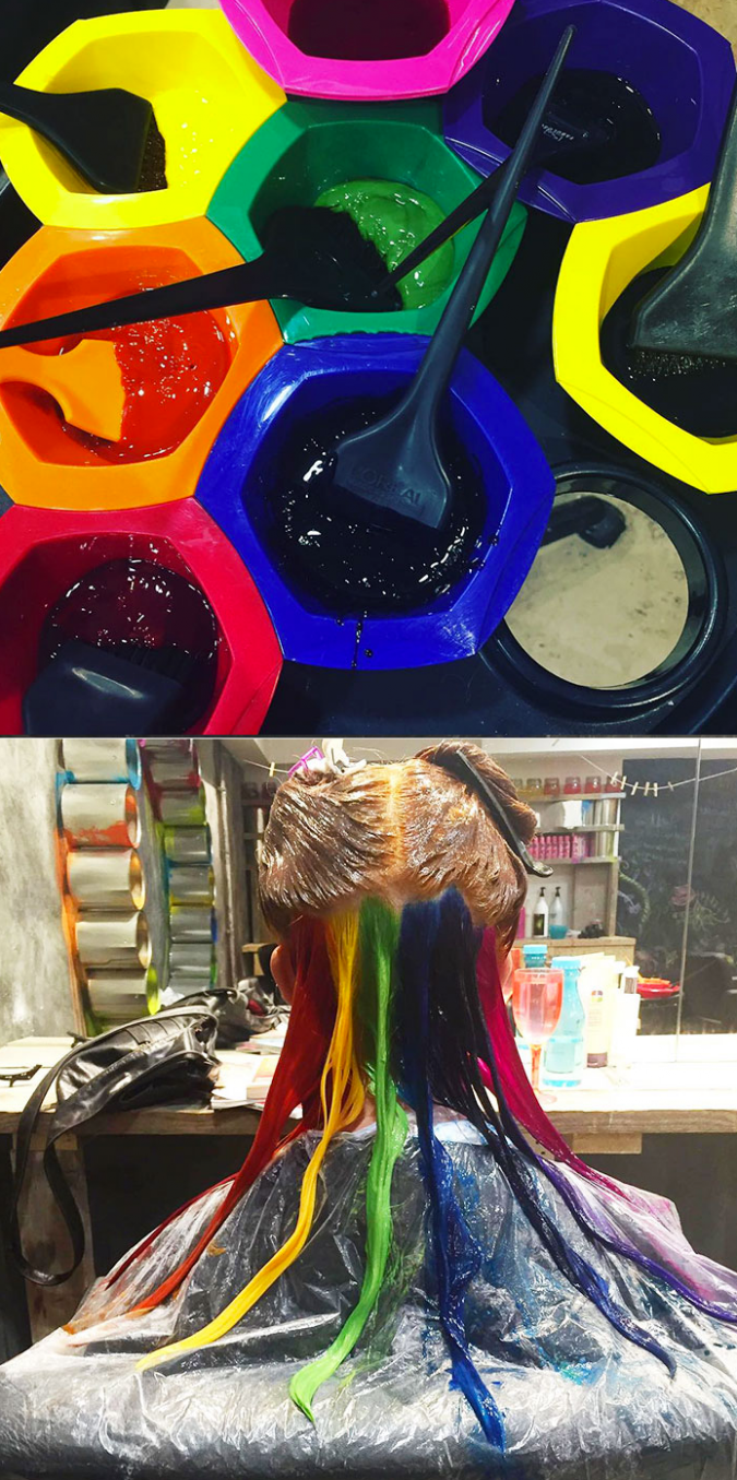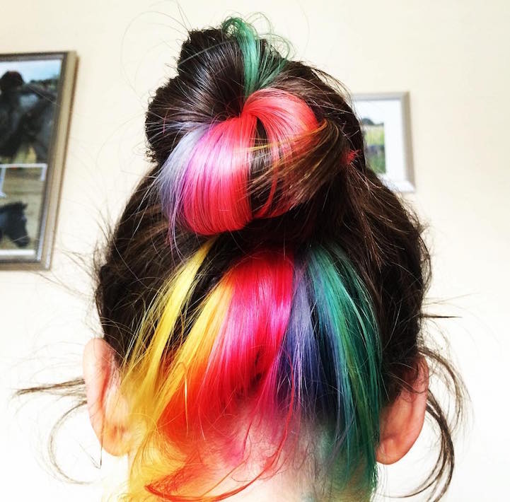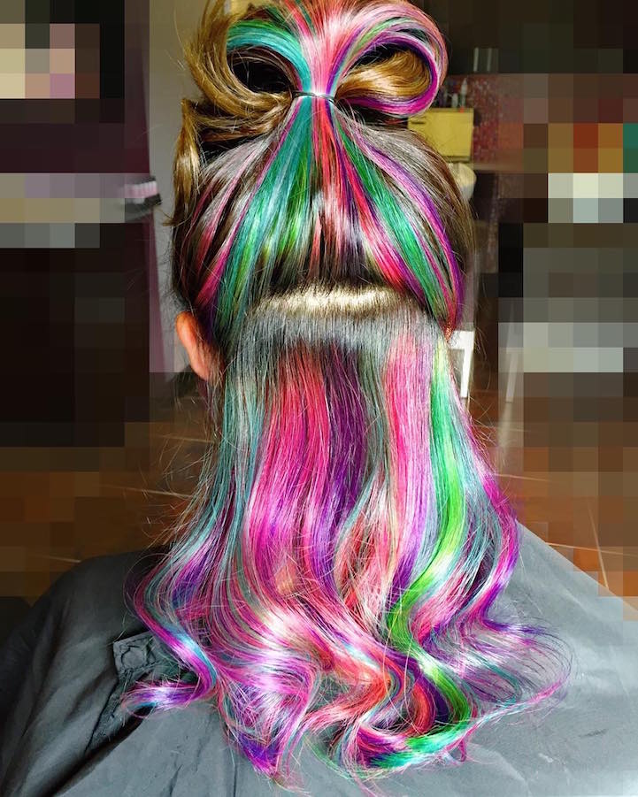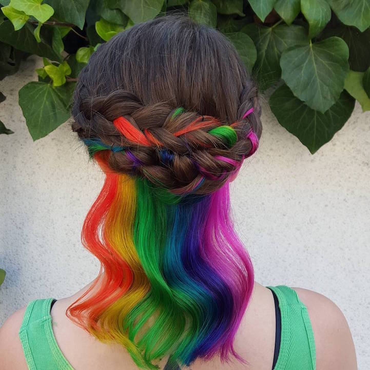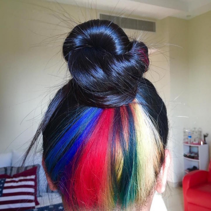 Суть этого нового модного направления для волос простое - парикмахер закрашивает в разные цвета только пряди находящиеся на затылке, и только те, которые находятся в самом низу или середине. Выглядит такая прическа очень эффектно.