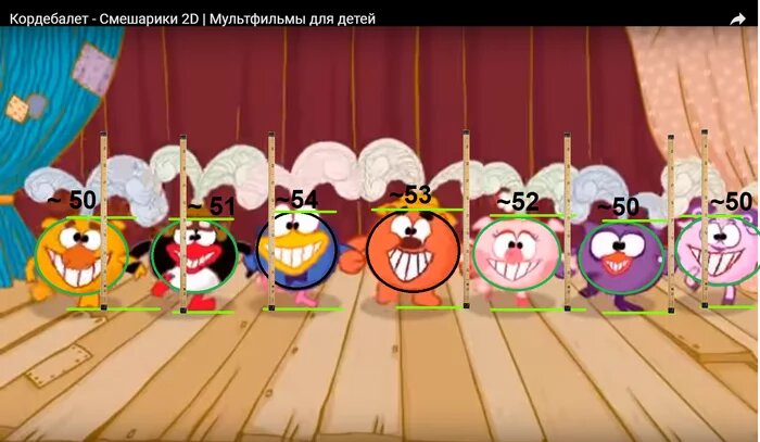 Далее был использован кадр из серии «Кордебалет», где Смешарики стоят в одну линию и их рост можно сравнить с ростом Копатыча.