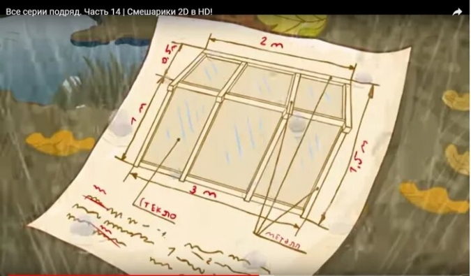 Основой для измерений послужил вот этот кадр с чертежом теплицы из мультфильма. Высота основания теплицы равна одному метру. Именно этот факт и был использован для дальнейших измерений.