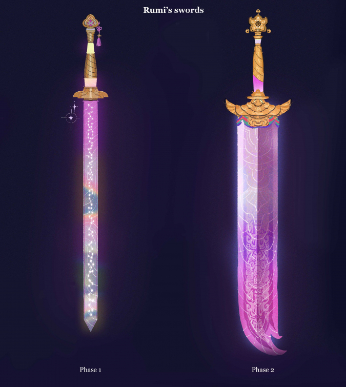 Оружие Руми носит название Four Tiger’s Evil Slayer — по-корейски 사인검 (四寅劍). Это меч, украшенный узором звёздных созвездий, отсылающий к реальному историческому оружию эпохи Чосон. В первом облике клинок прямой, с тонким лезвием и сияющими линиями, напоминающими небесную карту. Во второй фазе, после объединения с душой Джину, клинок принимает новую форму — более массивную, с изогнутым концом и узором тигра, вписанным в металл. Этот облик подчёркивает зрелость героини, её духовное пробуждение и готовность к решающей битве.