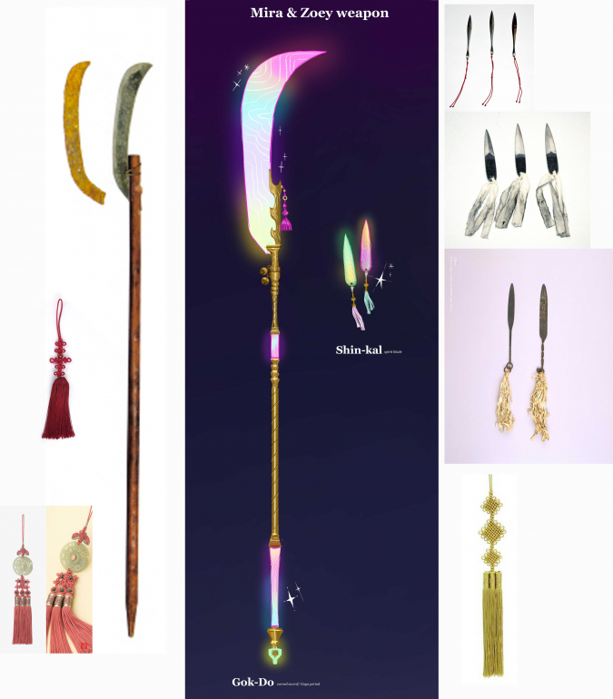 Оружие Миры носит название Gok-Do (곡도 / 曲刀), что переводится с корейского как «изогнутый меч». Это длинное древковое оружие с широким изогнутым лезвием, визуально напоминающее традиционное корейское копьё или гуань дао китайского происхождения. В реальной истории Gok-Do использовалось как оружие пехотинцев и охранников, а также для церемоний. В концепт-арте Миры её Gok-Do стилизован под фантастическое магическое оружие: он сияет радужными оттенками и украшен кисточками и элементами, отсылающими к восточной культуре. Массивное лезвие подчеркивает силу и решимость героини, а форма древка добавляет боевому стилю Миры изящество и динамику.