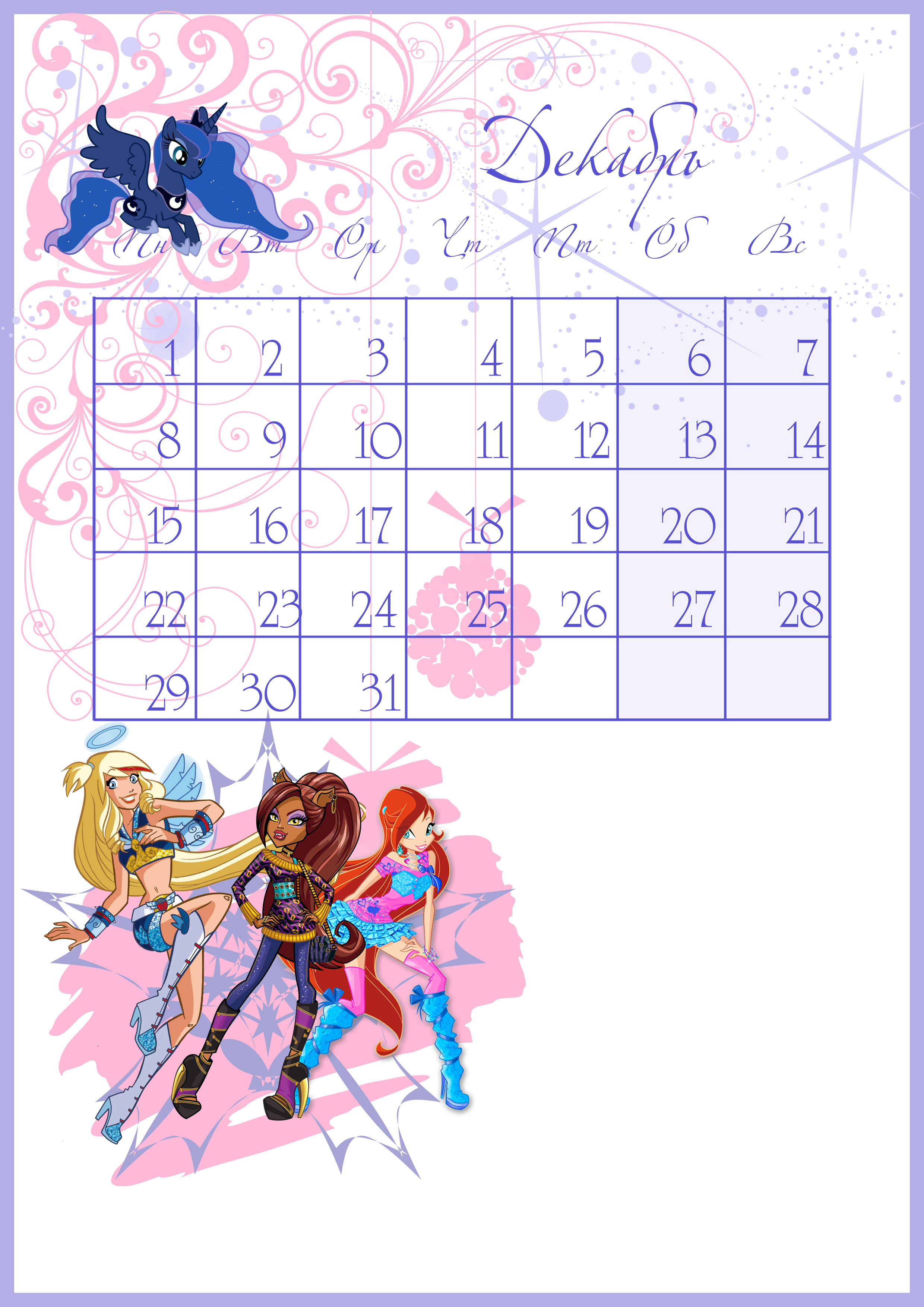 Календарь на Декабрь 2014 года с Блум, Раф, Клодин и принцессой Луной.