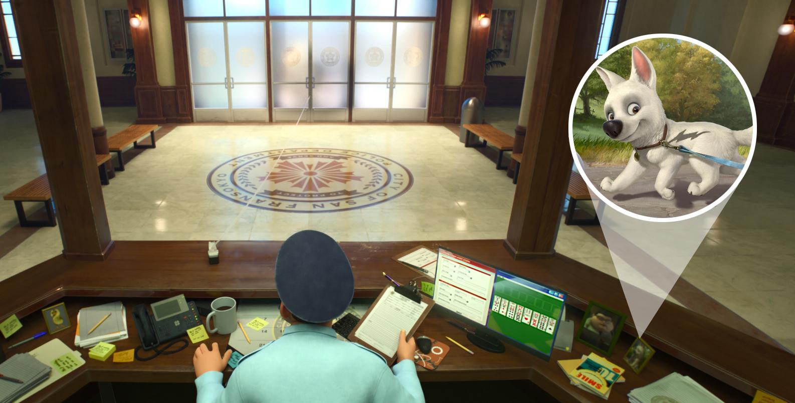 А вот еще один знаменитый пёс. В рамке у полицейского стоит фотография Вольта. Дело в том, что директор у "Города Героев" и у "Вольта" один и тот же.