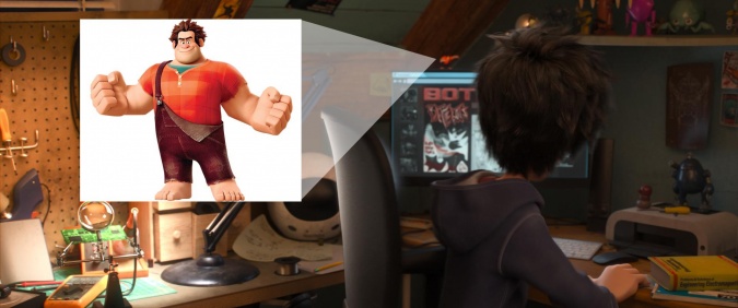 Она совсем маленькая и даже немного размытая, но это действительно фигурка Ральфа стоит у Хиро на мониторе.