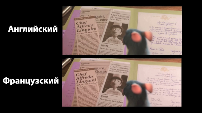 Письмо Гюсто в мультфильме "Рататуй" также было переведено на французский для зрителей во Франции.