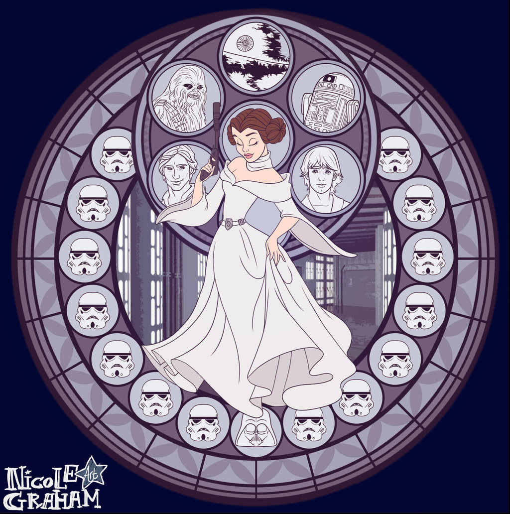 Принцесса Лея не была героиней мультфильма студии Дисней (как ты наверняка знаешь), но с тех пор как студия Дисней приобрела права на персонажей Звездных Войн, многие художники стали рисовать ее вместе с другими девушками.