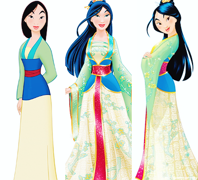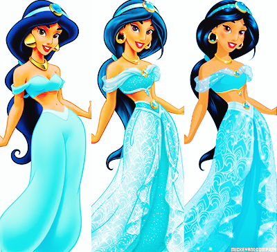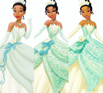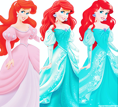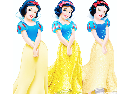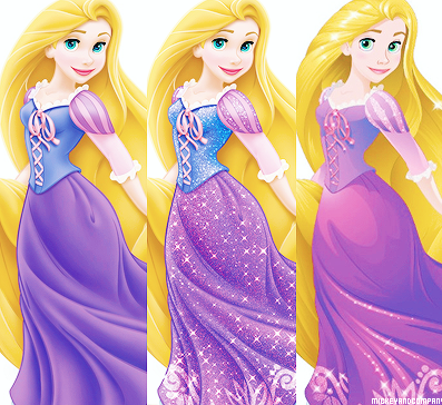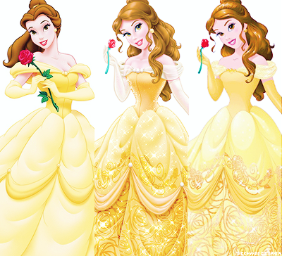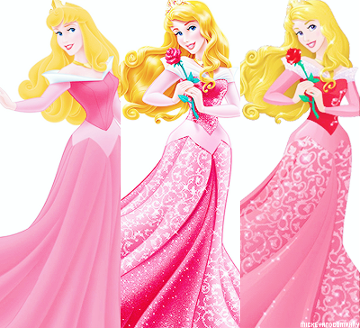 На этих картинках представлены оригинальные версии внешности каждой из принцесс, посередине идет картинка с редизайном 2012 года. Последним идет изображение Дисней Принцесс в официальной версии 2014 года. Именно так они выглядят на промо картинках, плакатах, рюкзаках, пеналах и других товарах.