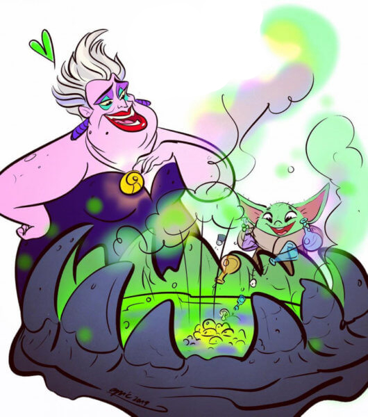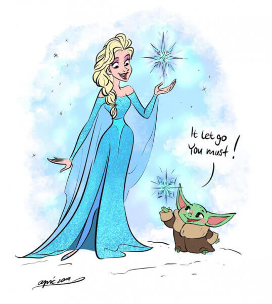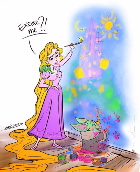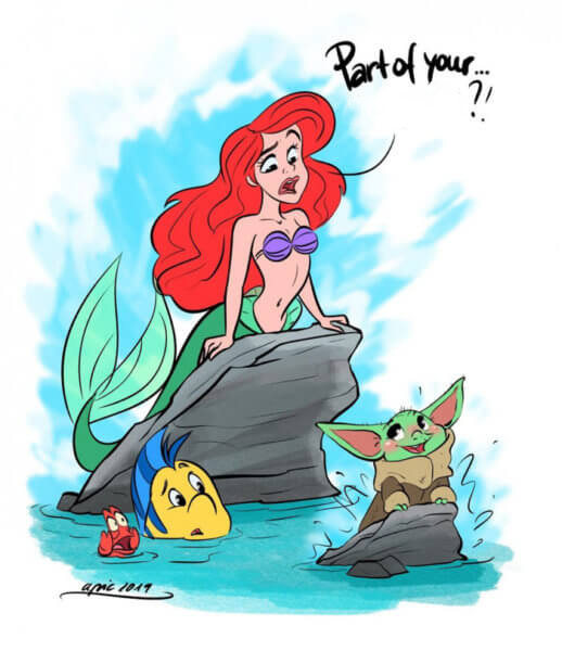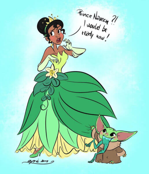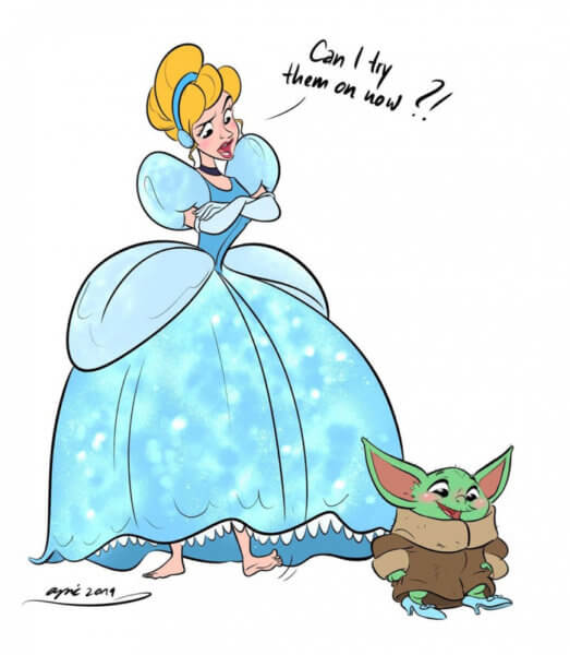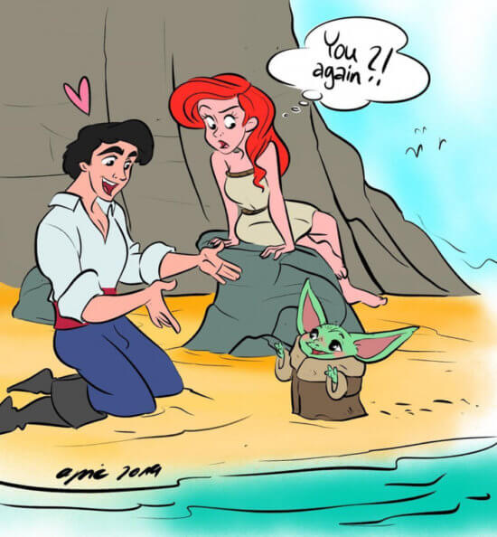 Поклонник Диснея и Малыша Йоды Алекс Пик - очень талантливый художник из Германии - недавно выпустил серию работ, в которых сам малыш Йода общается с самыми разными нашими любимыми принцессами Дисней, от Золушки и Рапунцель до Ариэль и принцессы Тианы. И хоть малыш Йода невероятно милое создание, почему-то на рисунках он скорее мешает героям Дисней (правда далеко не всем).