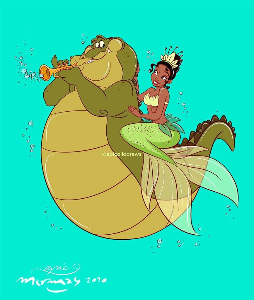 Художник по имени Alex Pick не только добавил к образам принцесс русалочьи хвосты, но и изобразил их сидящими верхом на морских коньках. И большинство из этих морских коньков на самом деле русализация коней и других питомцев, принадлежащих принцессам.