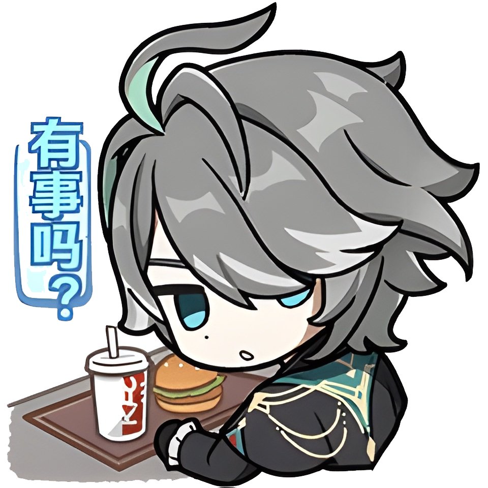Альхайтам с подносом KFC и надписью «有事吗?» («Что-то случилось?») — сдержанный и слегка усталый взгляд.