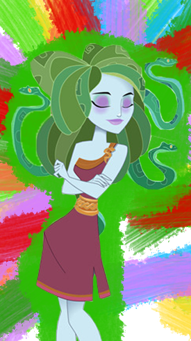 Медуза Горгона - чудовище с женским лицом и змеями вместо волос. Медуза Горгона слепа, но её волосы - змеи, которые дают ей советы по выбору одежды и стиля. На самом деле она просто помешана на моде.
