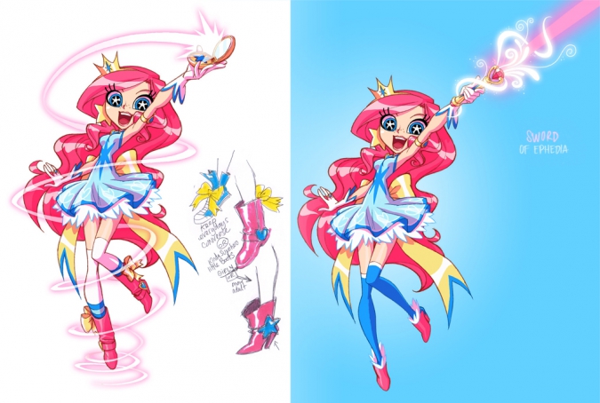 Эти картинки - самые ранние концепт арты, а точнее даже пробные тестовые рисунки рисунки Бертранда Тодеско, работающего над созданием мультсериала "Лолирок". Сам он хотел чтобы Айрис была с темными волосами, но на всякий случай нарисовал и версию Айрис блондинки. Продюсеры выбрали светлый вариант волос, хотя Айрис с темными волосами тоже смотрится симпатично (художник попытался изобразить ее в стиле Кэти Перри).