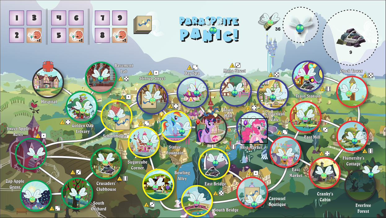 Parasprite Panic — кооперативная (игра для нескольких игроков) настольная игра, действия которой разворачиваются в серии «Swarm of Century», где всем знаменитая шестерка пыталась изо всех сил вымести параспрайтов из Понивиля. Игра в некотором роде повторяет события серии — Вам и вашим друзьям предлагается взять на себя роль одной из главных героинь и спасти жителей деревушки от прожорливых паразитов. Игра рассчитана на 6-х игроков и крайне советуется играть именно вшестером. Роль каждой героини в игре уникальна и незаменима, а потому в тандеме с остальными и решать проблемы гораздо проще. а проблем, уж поверьте, будет предостаточно. Параспрайты вечно растущей лавиной поглощают Понивиль, а потому в игре нет времени на соревнование. Одна победа на всех, как и поражение.
