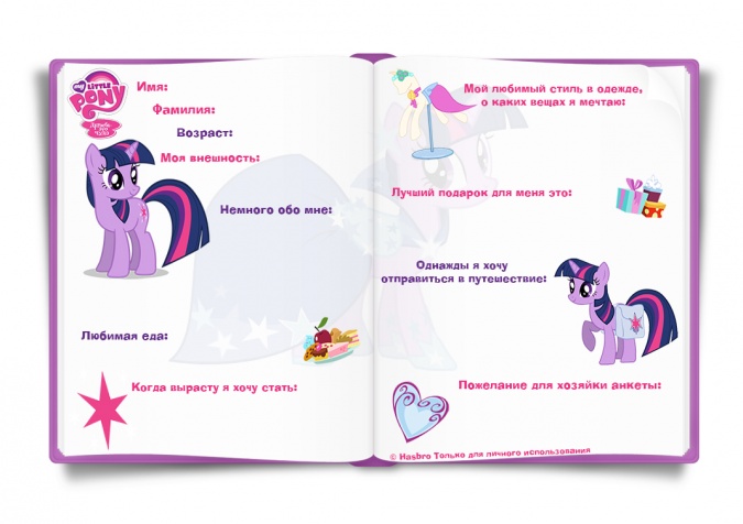 Эта анкета будет выходить постранично. В анкете будет несколько страничек - в стиле разных пони (Искорки, Рарити, Флаттершай, Пинки Пай, Эпплджек, Рэйнбоу Дэш, принцессы Луны, принцессы Селестии и принцессы Каденс). В будущем возможно пополнение коллекции с другими персонажами. Конечно же еще будет страничка для хозяйки анкеты и обложка для анкеты. Все странички будут оформлены изображениями персонажей из мультфильма Дружба это Чудо. Так что если твои друзья тоже любят пони, им обязательно понравится заполнять такую анкету.