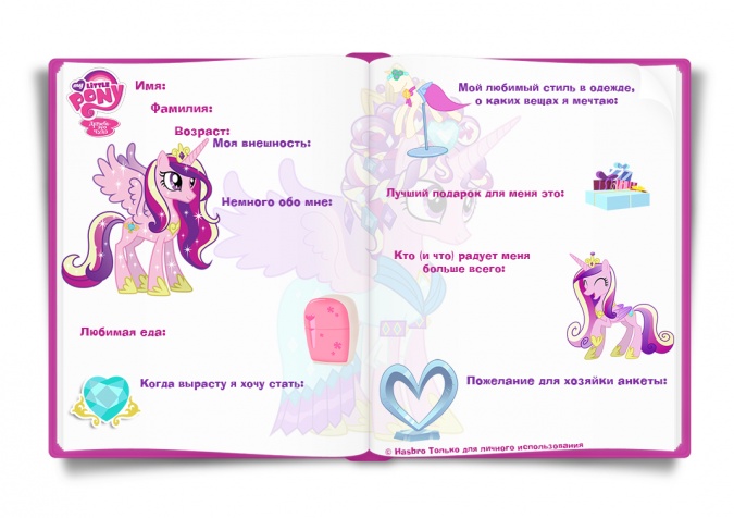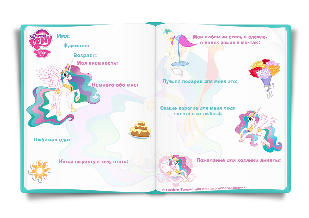 Анкета для девочек - Friendship is magic / Дружба это чудо - странички с принцессами Каденс, Луной и Селестией