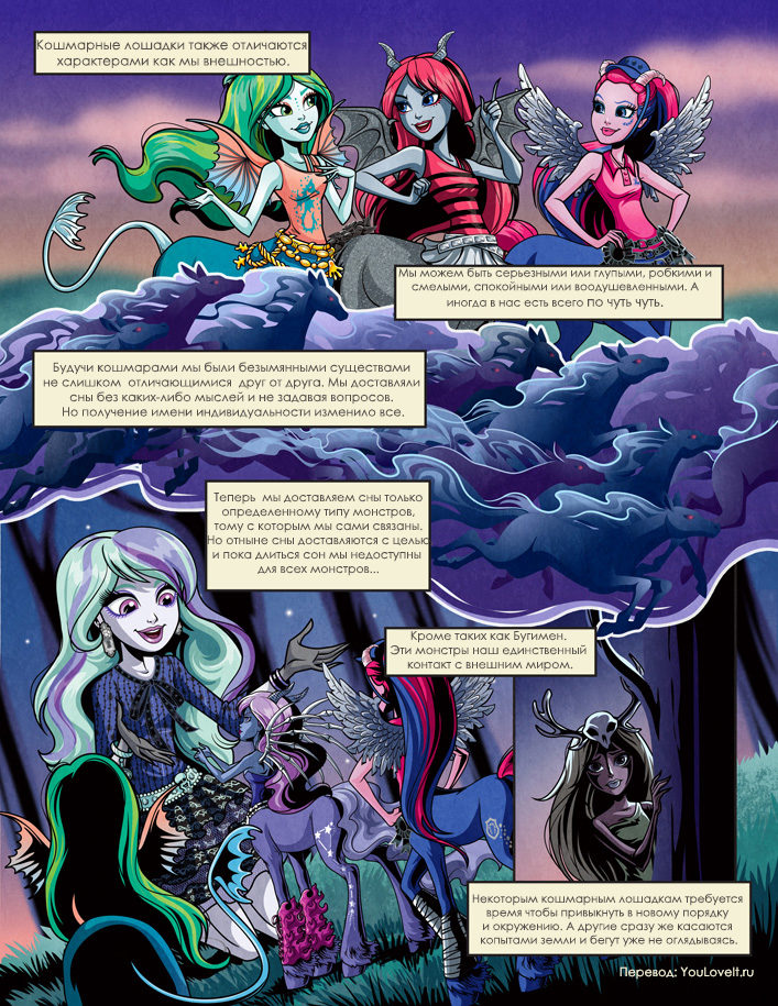 В прошлых страничках комикса про кошмарных лошадок Fright-Mares мы узнали о происхождении этих лошадок. Эти странички - продолжение официального комикса, публикуемого компанией Маттел онлайн. Постепенно мы узнаем о них все больше и больше. На этих страничках нас знакомят с Pyxis Prepstockings и Bay.