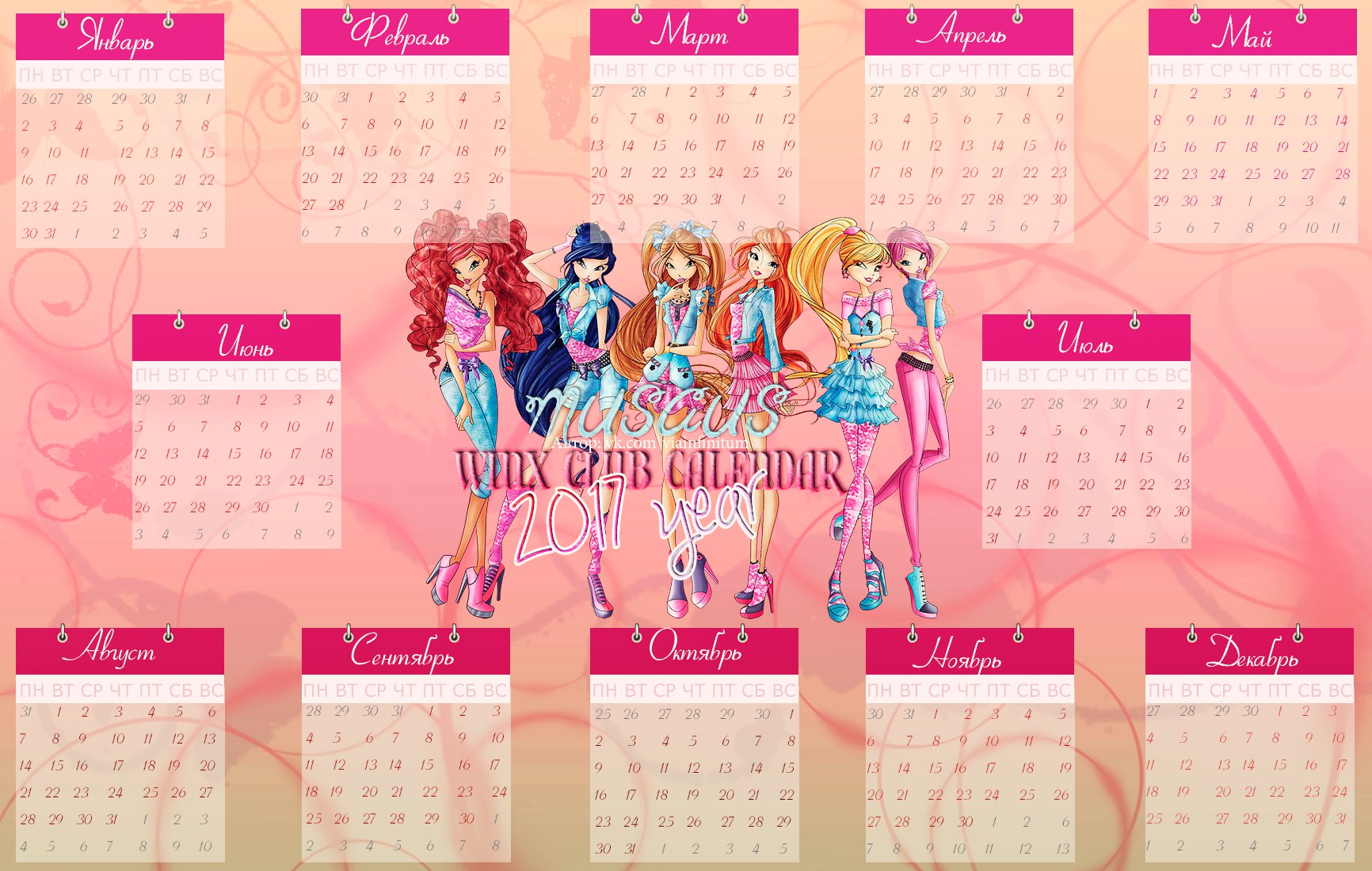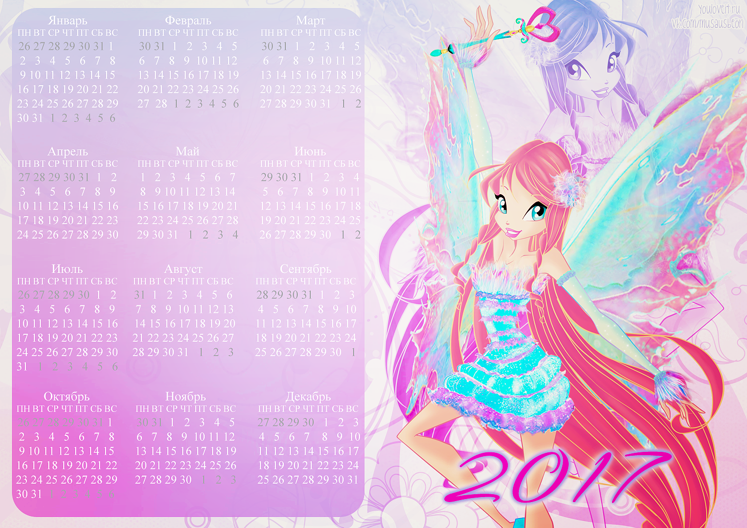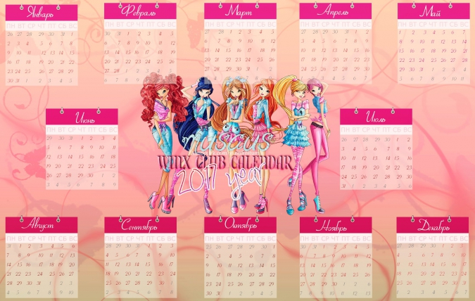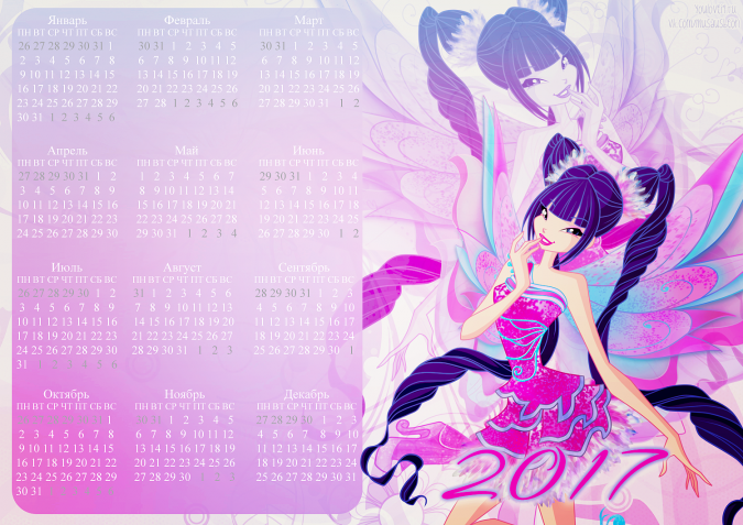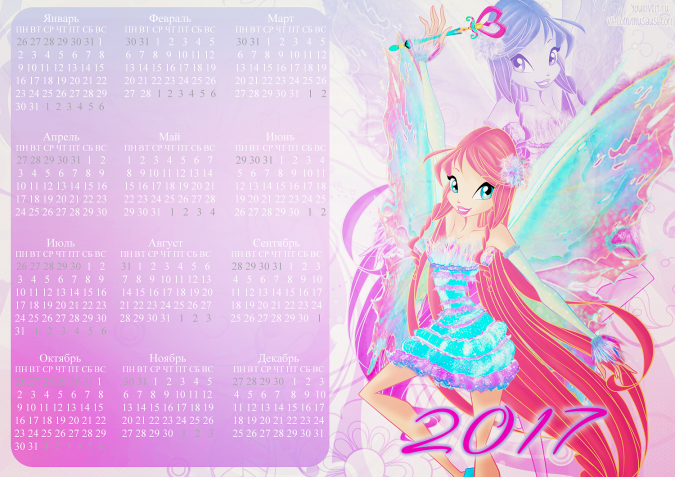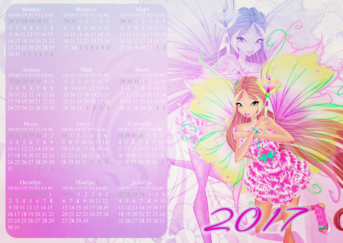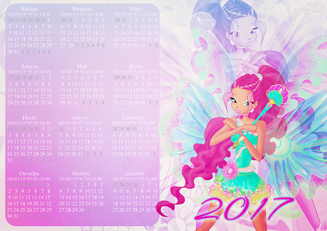 Спасибо сообществу Musaus и Полине Чешкиной за такую красивую коллекцию календарей с Винкс на 2017й год. Ты можешь распечатать их или использовать как заставку для компьютера, телефона, планшета или ноутбука.
