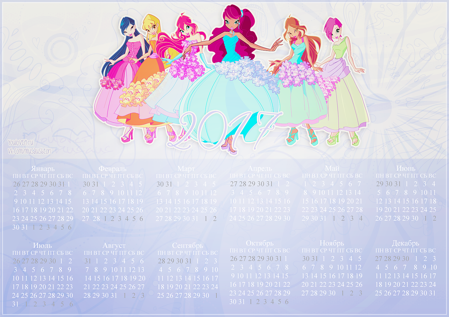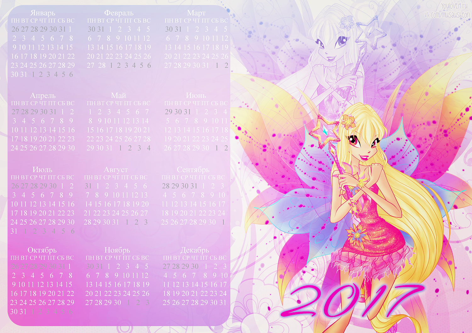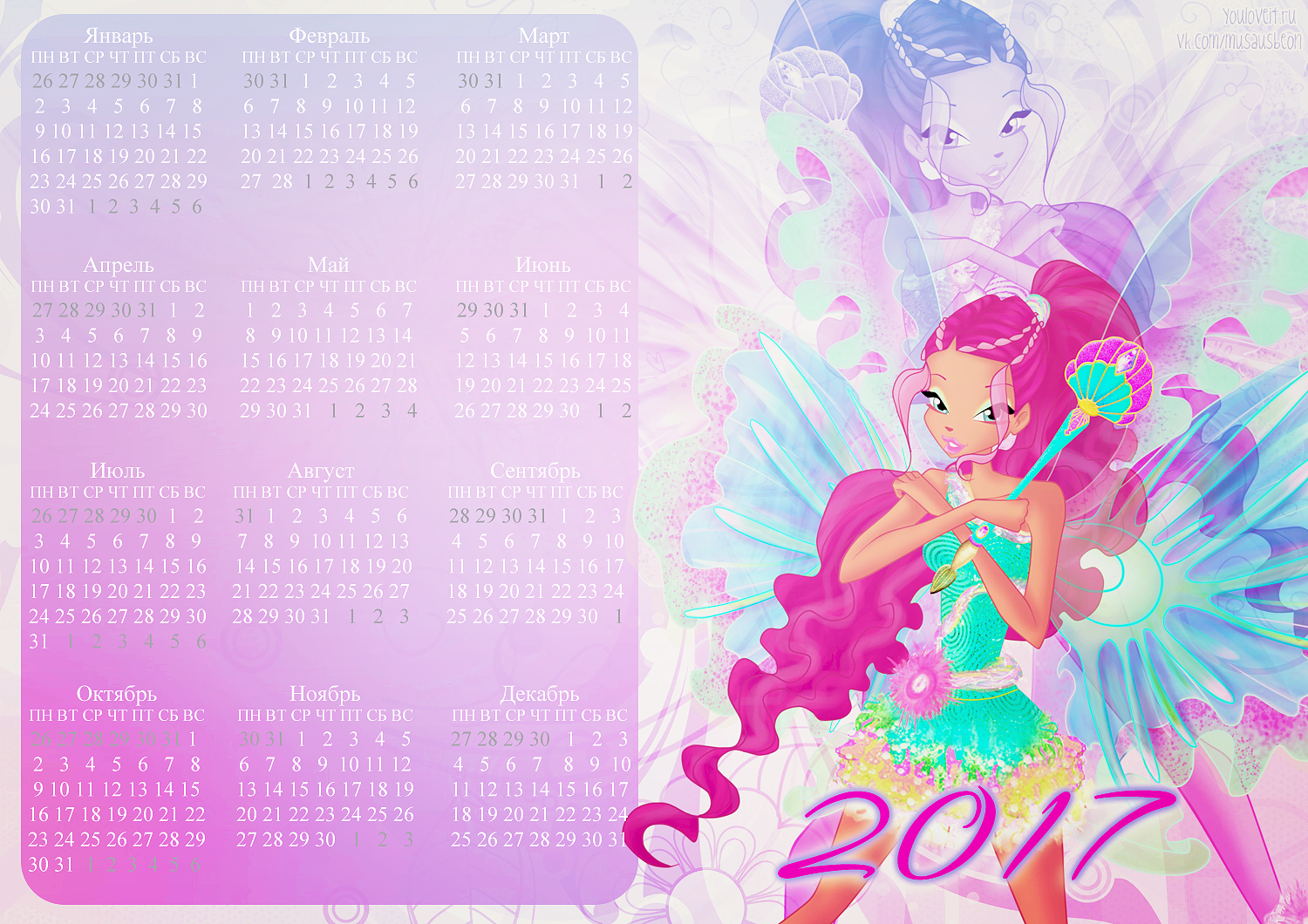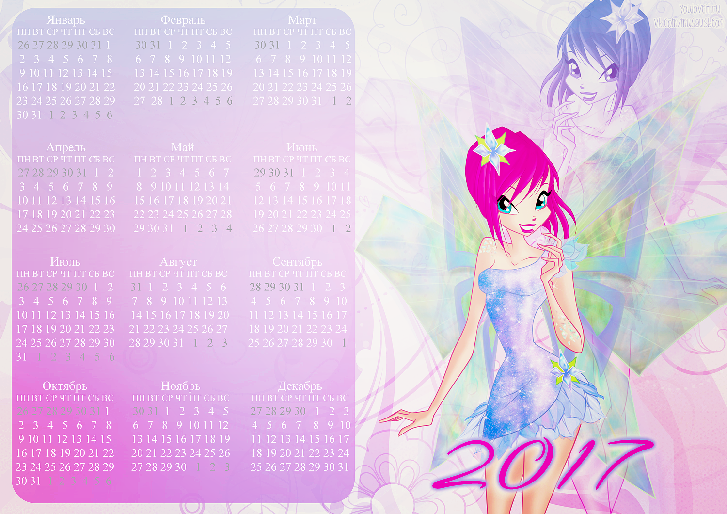 Спасибо сообществу Musaus и Полине Чешкиной за такую красивую коллекцию календарей с Винкс на 2017й год. Ты можешь распечатать их или использовать как заставку для компьютера, телефона, планшета или ноутбука.