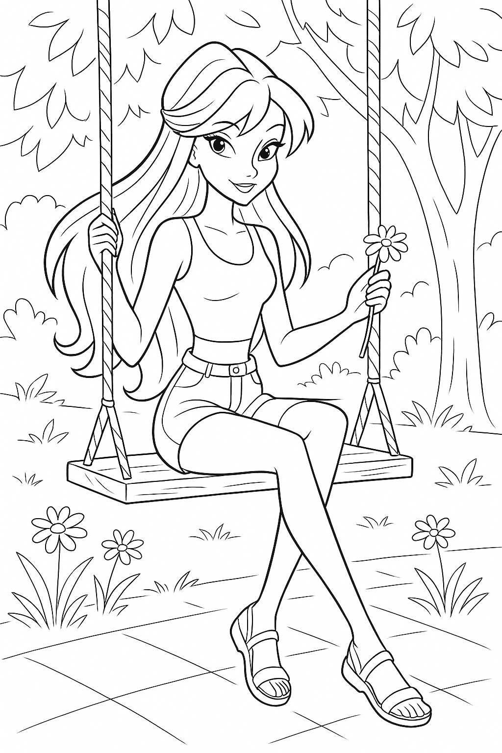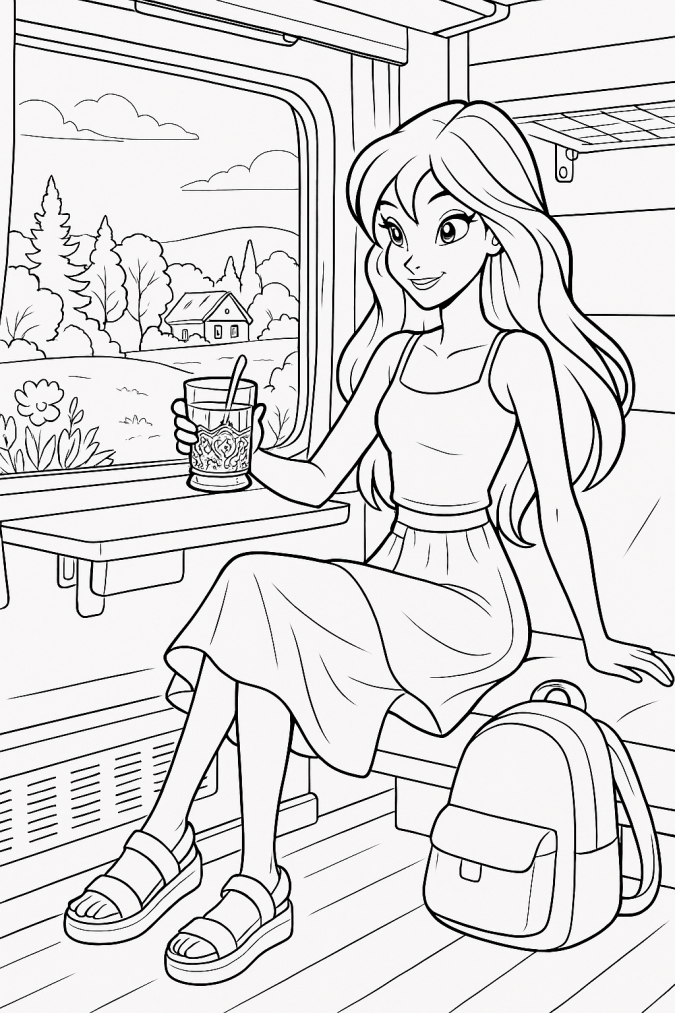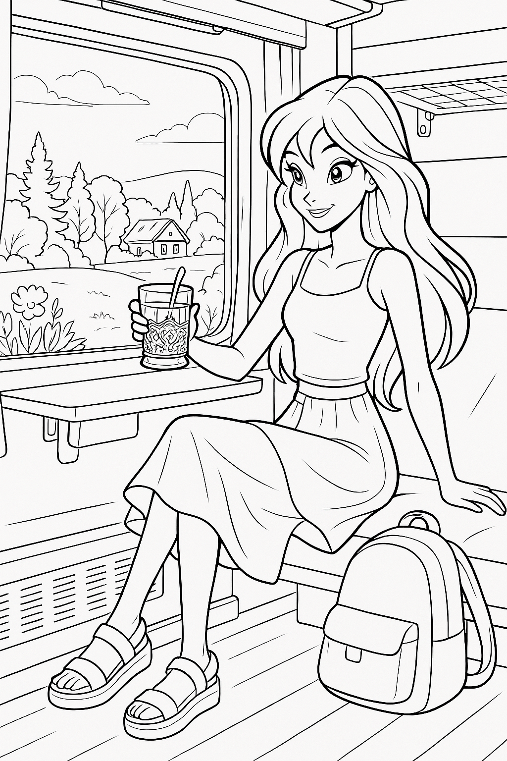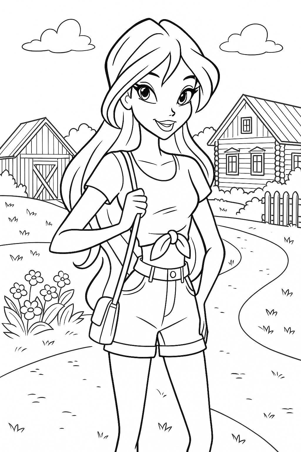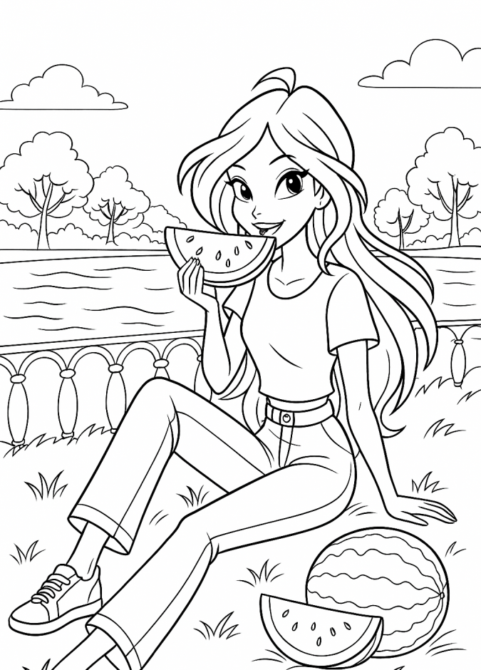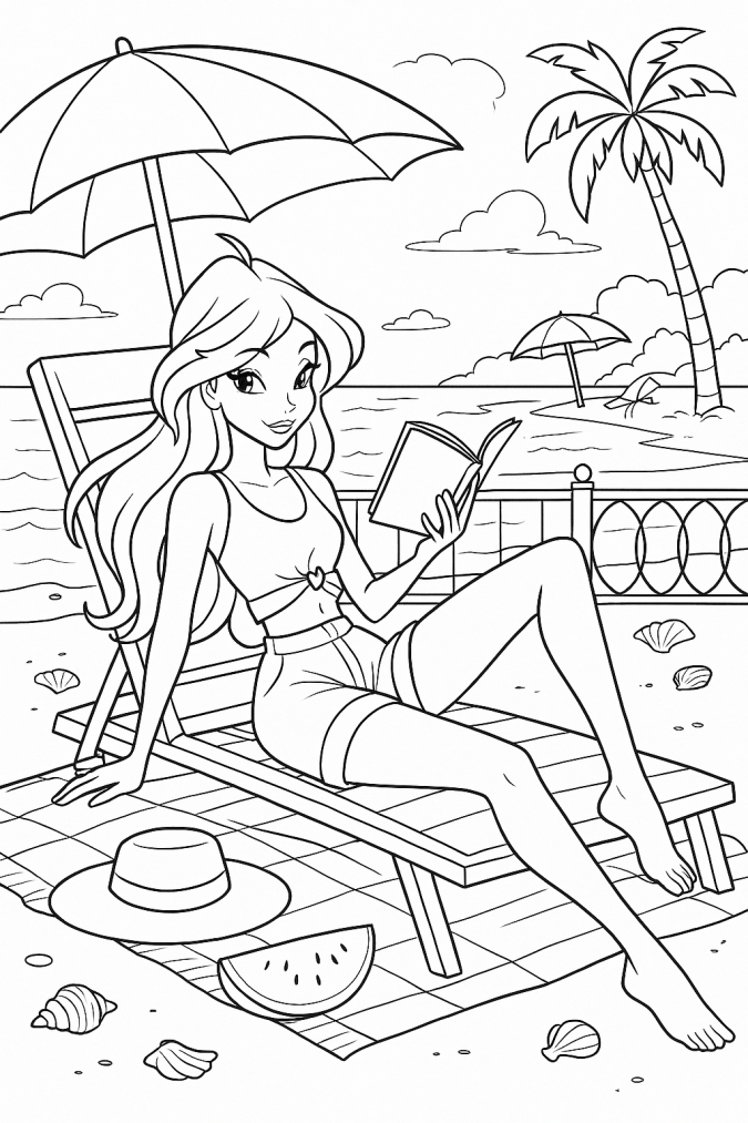 В этой подборке собраны раскраски на тему лета, вдохновлённые образами девушек из мира Winx Club. Здесь — не волшебные сражения, а повседневные моменты, знакомые каждому: поездки на велосипеде, отдых на пляже с книгой, прогулки по парку, поездка в поезде, арбуз у речки или просто день в городе с телефоном в руках.
