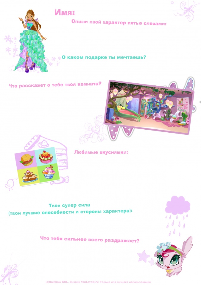 Мы забыли о продолжении анкеты с феями Винкс, в которой нужно было не только отвечать на вопросы, но и выполнять некоторые творческие задания.