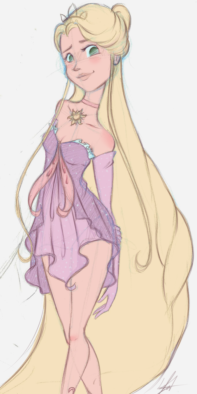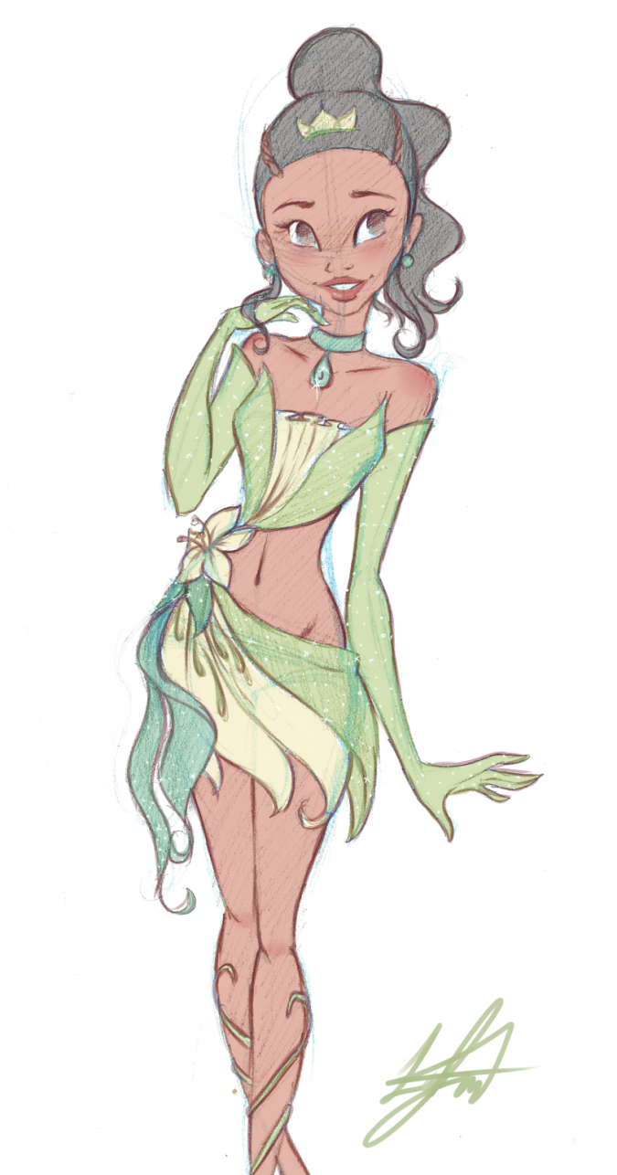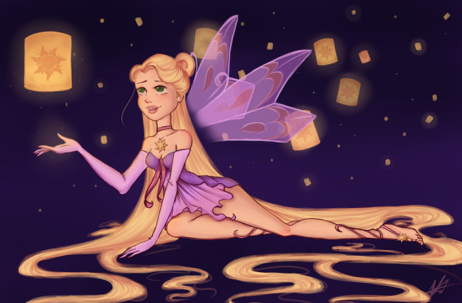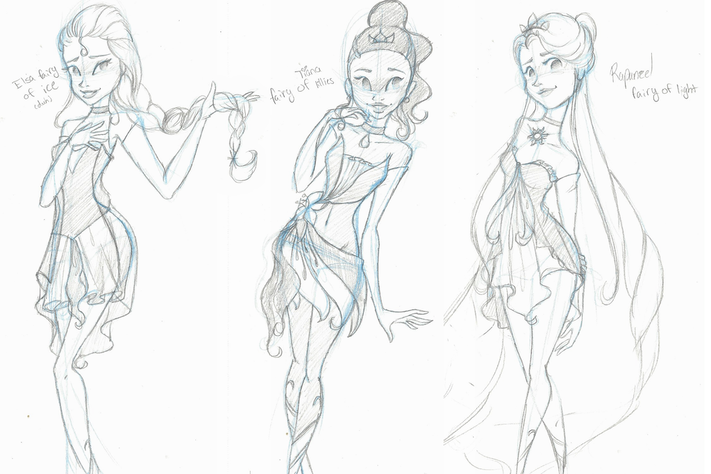 Автор этой идеи - Faunab решила объединить в своих рисунках знаменитые образы героинь Дисней и стиль фей Винкс. Точнее даже элементы их образов из всеми любимого старого превращения Энчантикс. На этих рисунках уже не принцессы, это феи, например Рапунцель по задумке - фея света, а Тиана - фея Лилий. На этом наброске есть еще и Эльза - фея льда, вот только раскрашенной её версии пока что нет.
