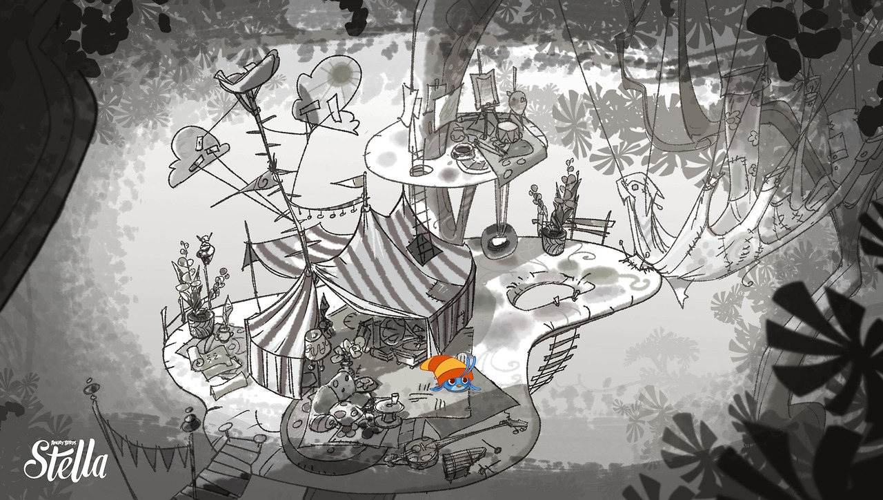 Стелла живет на верхушке дерева. У нее красивый домик в светлых тонах и с яркими элементами. У нее есть и гамак, и место для отдыха вместе с друзьями и даже уникальная конструкция - скейтборд с листиком, по сути представляет собой параплан.